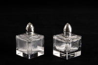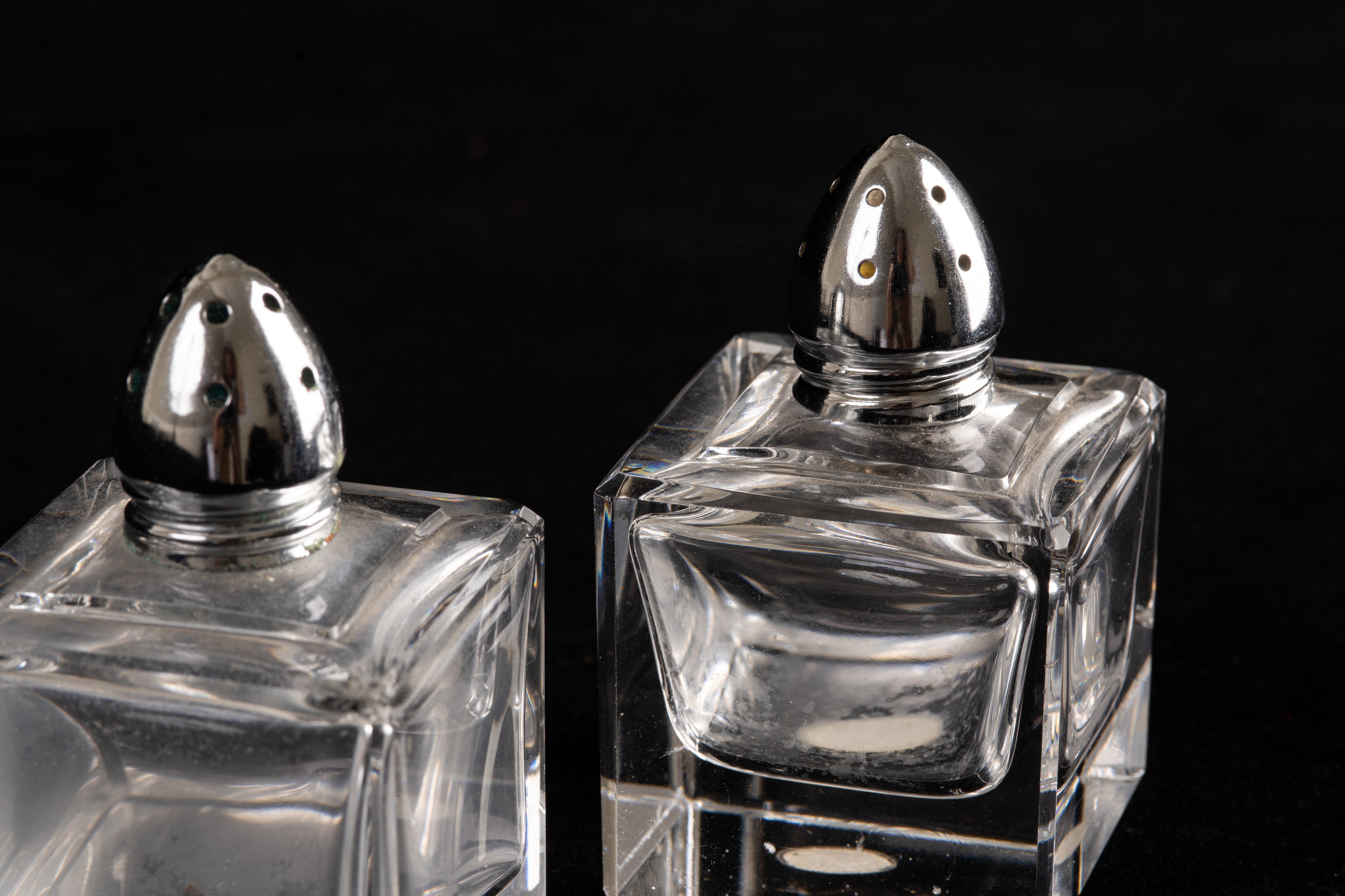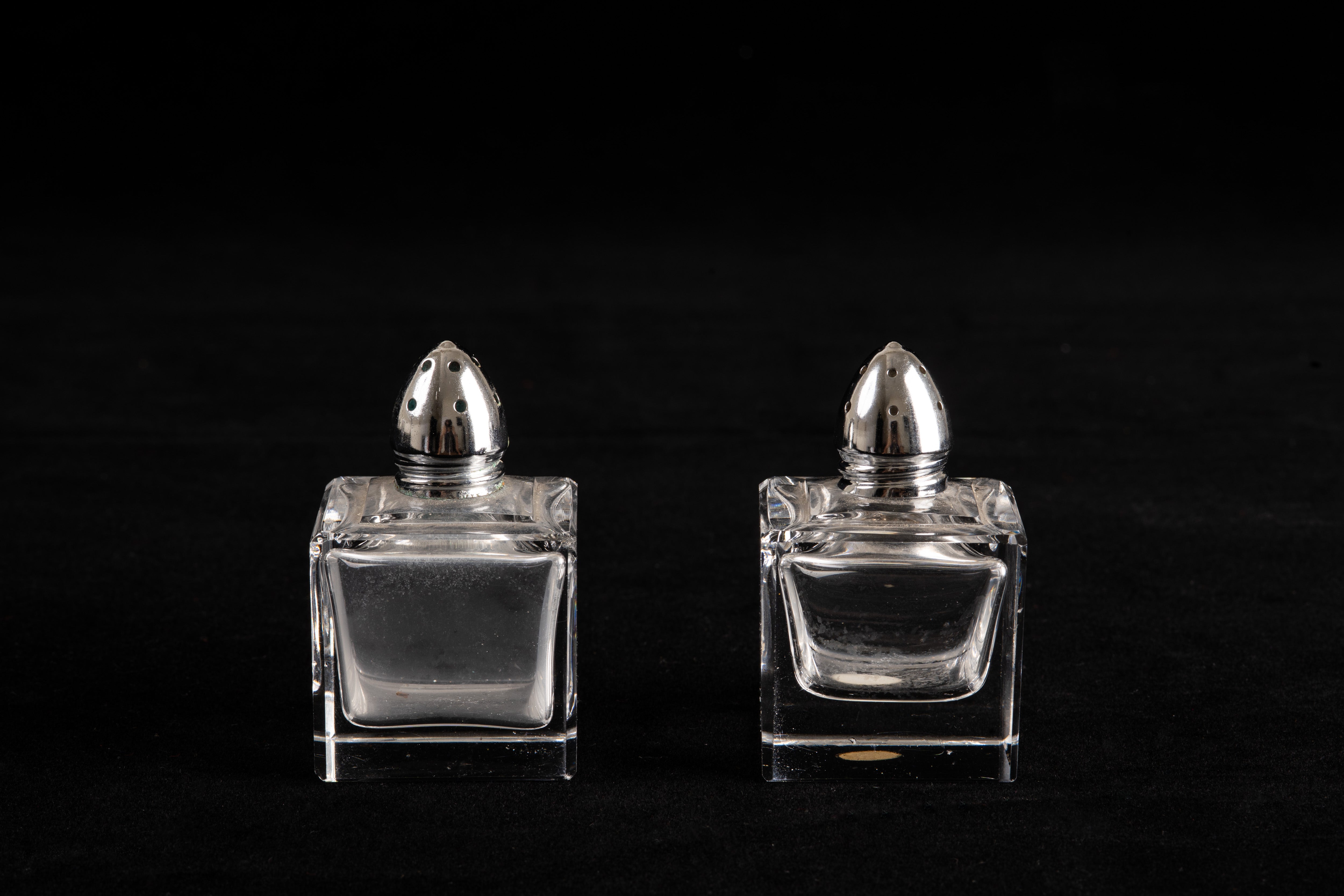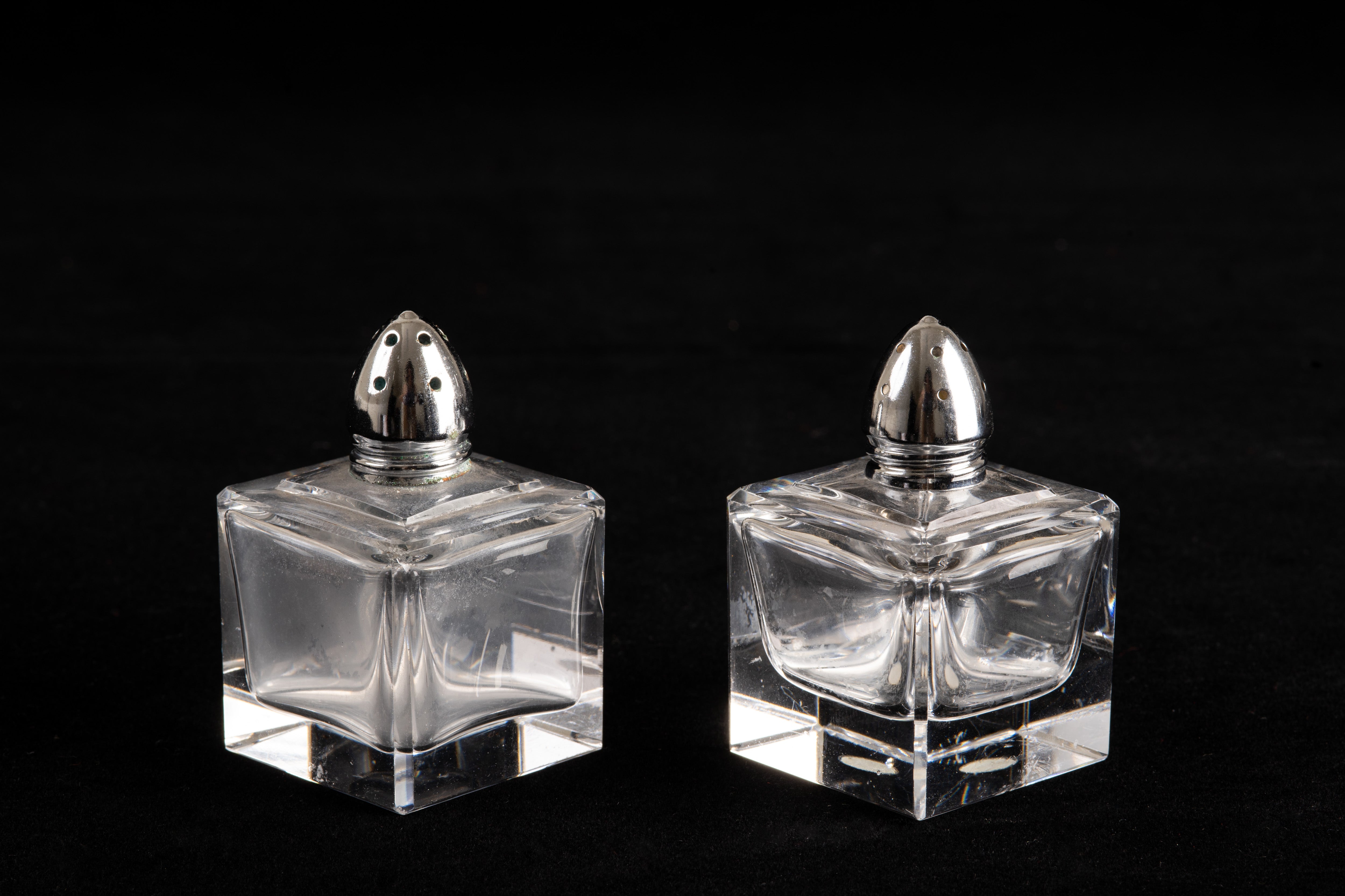 這套水晶玻璃調味罐組,有著厚實的玻璃體,以及子彈造形的出粉口,其中一件貼有「MADE IN WESTERN GERMANY」的貼紙。這類由西德出品的水晶玻璃餐具,多半為戰後 1950 至 70 年代間的產品,以此類造型為例,許多皆生產於巴伐利亞地區,再由紐約的 Irving W. Rice & Co. 進口至美國。