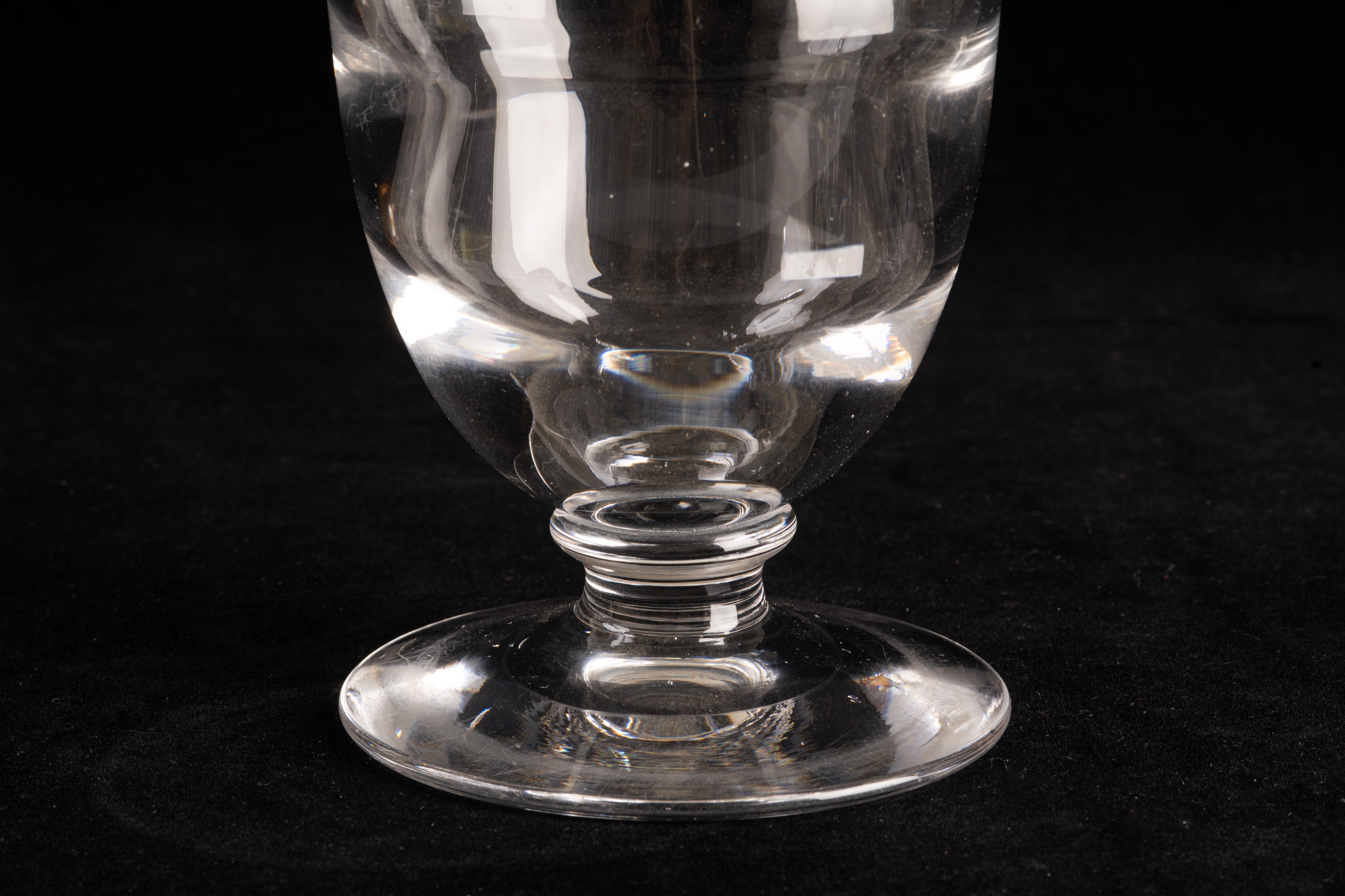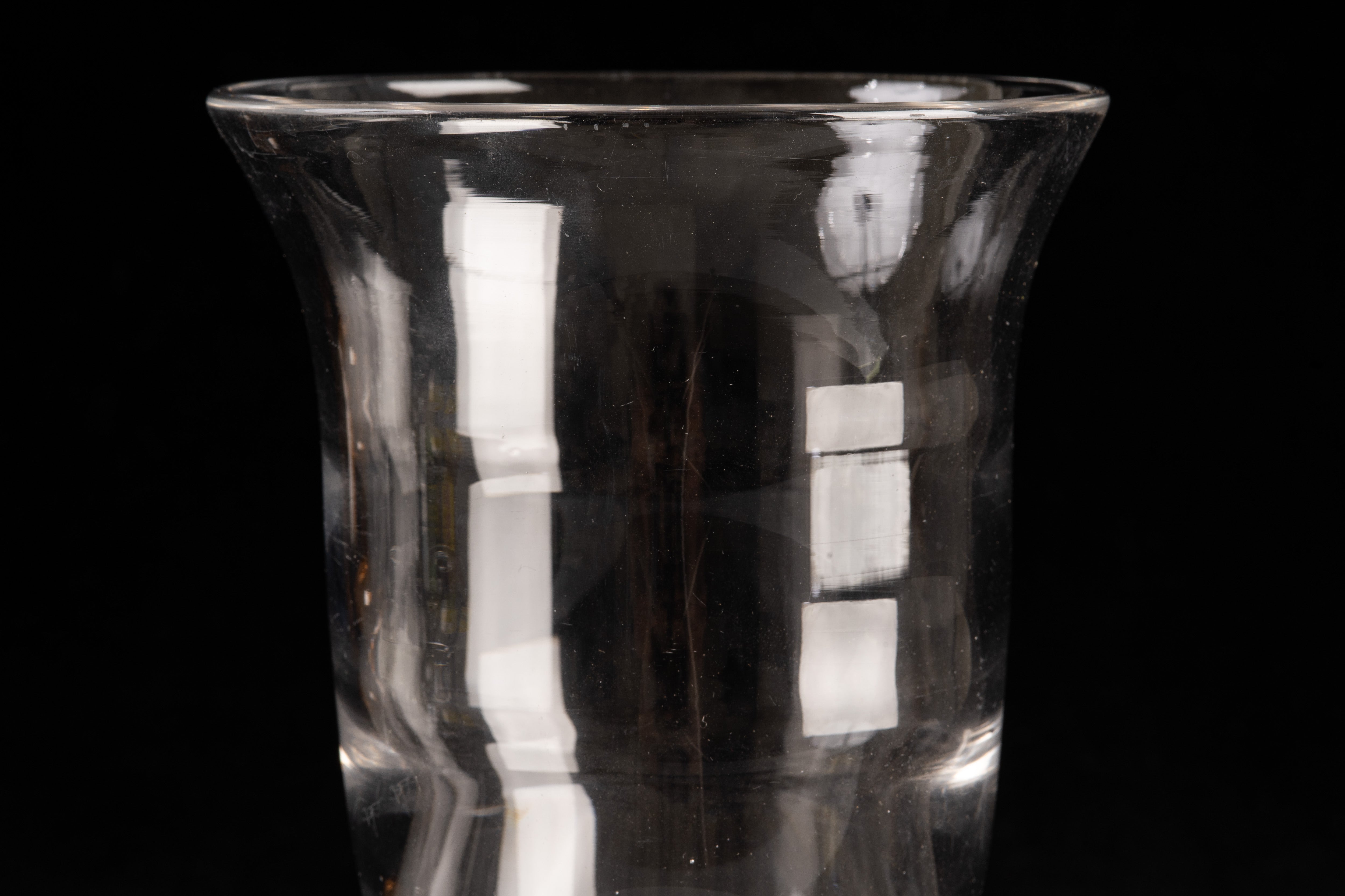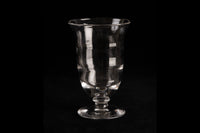 這款古樸的倒鐘型玻璃花瓶,其造型源於 19 世紀維多利亞時期餐桌上的「芹菜盅」。當時的芹菜是相當稀有、高級的食物,也因此主人在招待賓客時,須將芹菜如花一樣豎插在裝滿冰水的透明容器裡,以顯貴氣。這類餐具從維多利亞時期的繁複貴氣,到 20 世紀初期逐漸變成素雅平實。到了 1940 年代之後,由於芹菜普及,這類造型轉而發展成大型的花瓶或是小型的酒杯,形成一種摹古的意趣,裝飾上也變成素雅無紋的形式。
